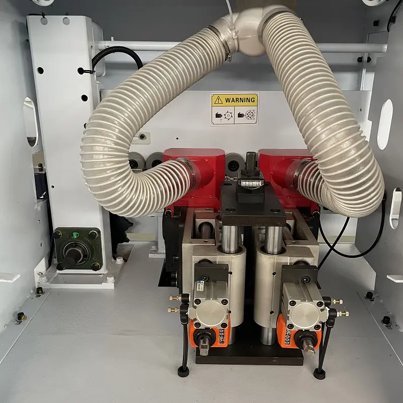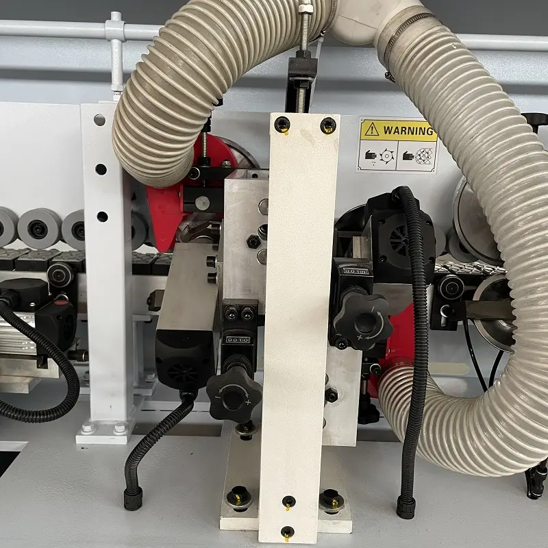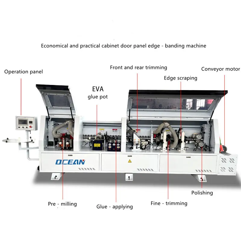 The functions of automatic single-trim edge banding machine: Pre-milling, Lower glue pot, Endcutting, Fine trimming, Corner Rounding, Scraping and Polishing.