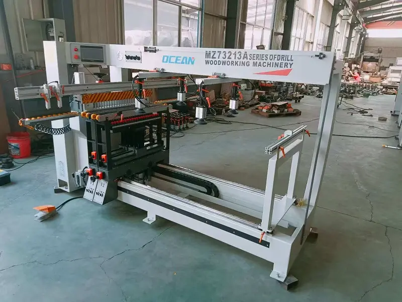 The three-row drilling machine is suitable for drilling on MDF, particleboard, plywood, PVC boards, acrylic (plexiglass), and solid wood panels.